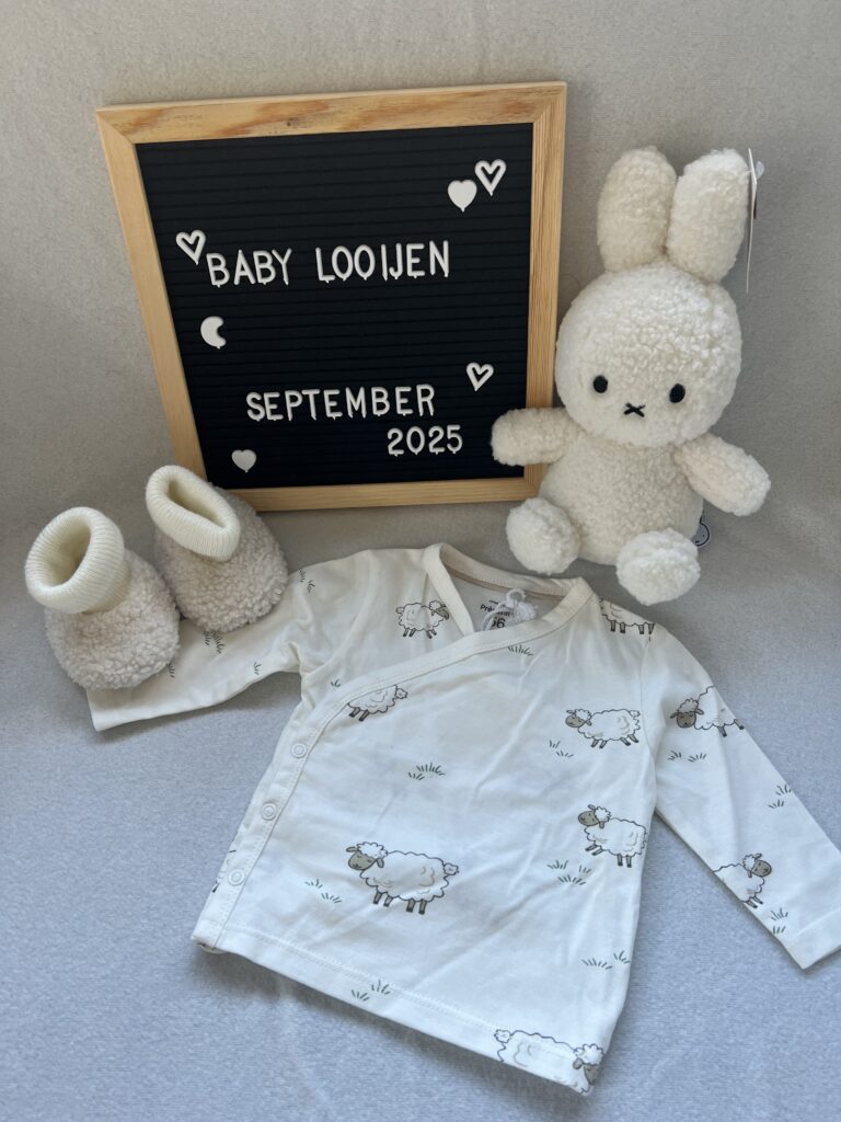 Langzaam begonnen we ook kleine dingen te kopen: neutrale kleertjes, zacht en klein. Dingen die je eigenlijk nog helemaal niet nodig hebt, maar die het wel ineens heel echt maken. Dit waren de weken waarin zwanger zijn nog vooral ging over samen. Over wennen, over kleine voorbereidingen en over vertrouwen dat alles goed zou gaan.